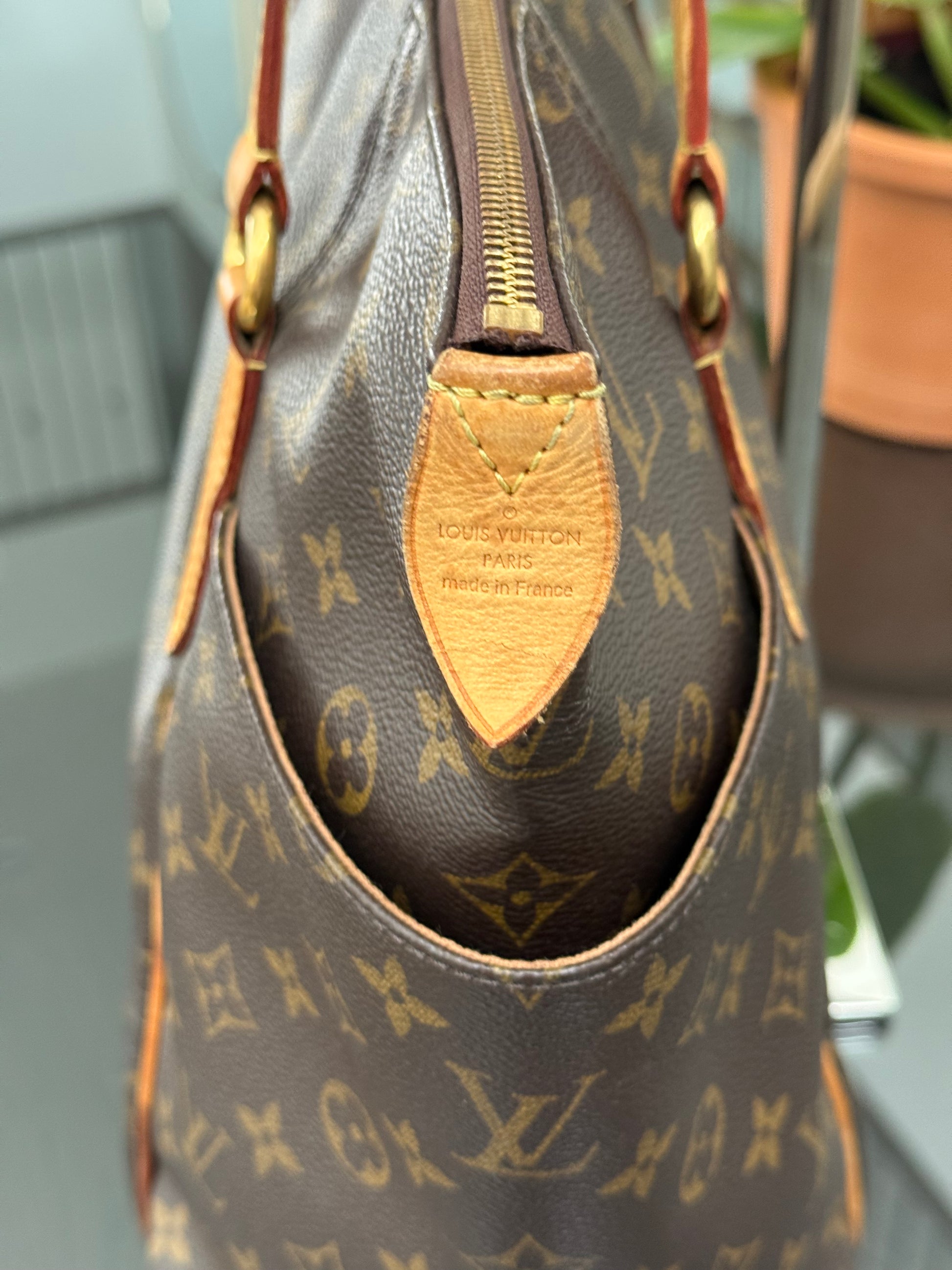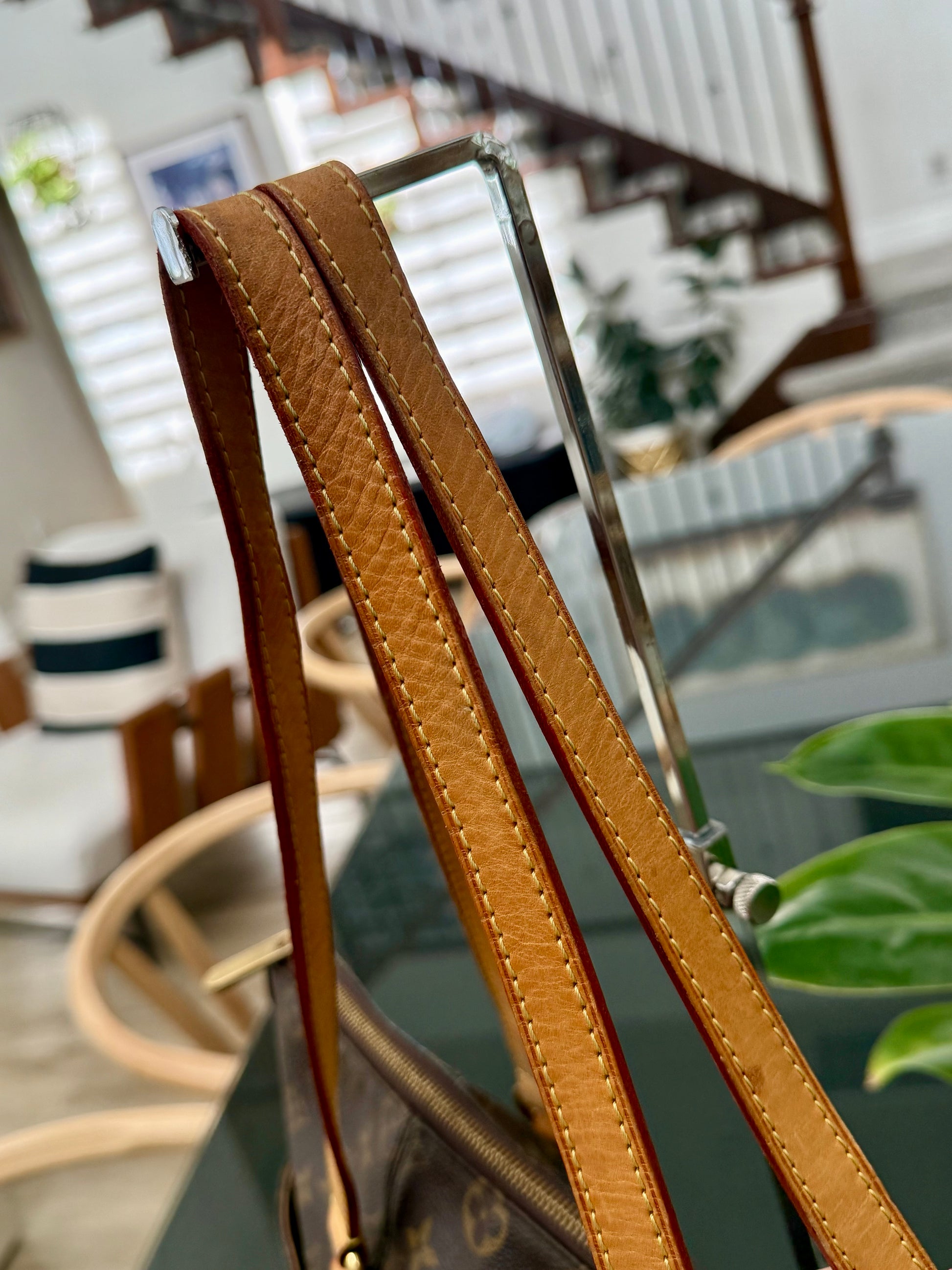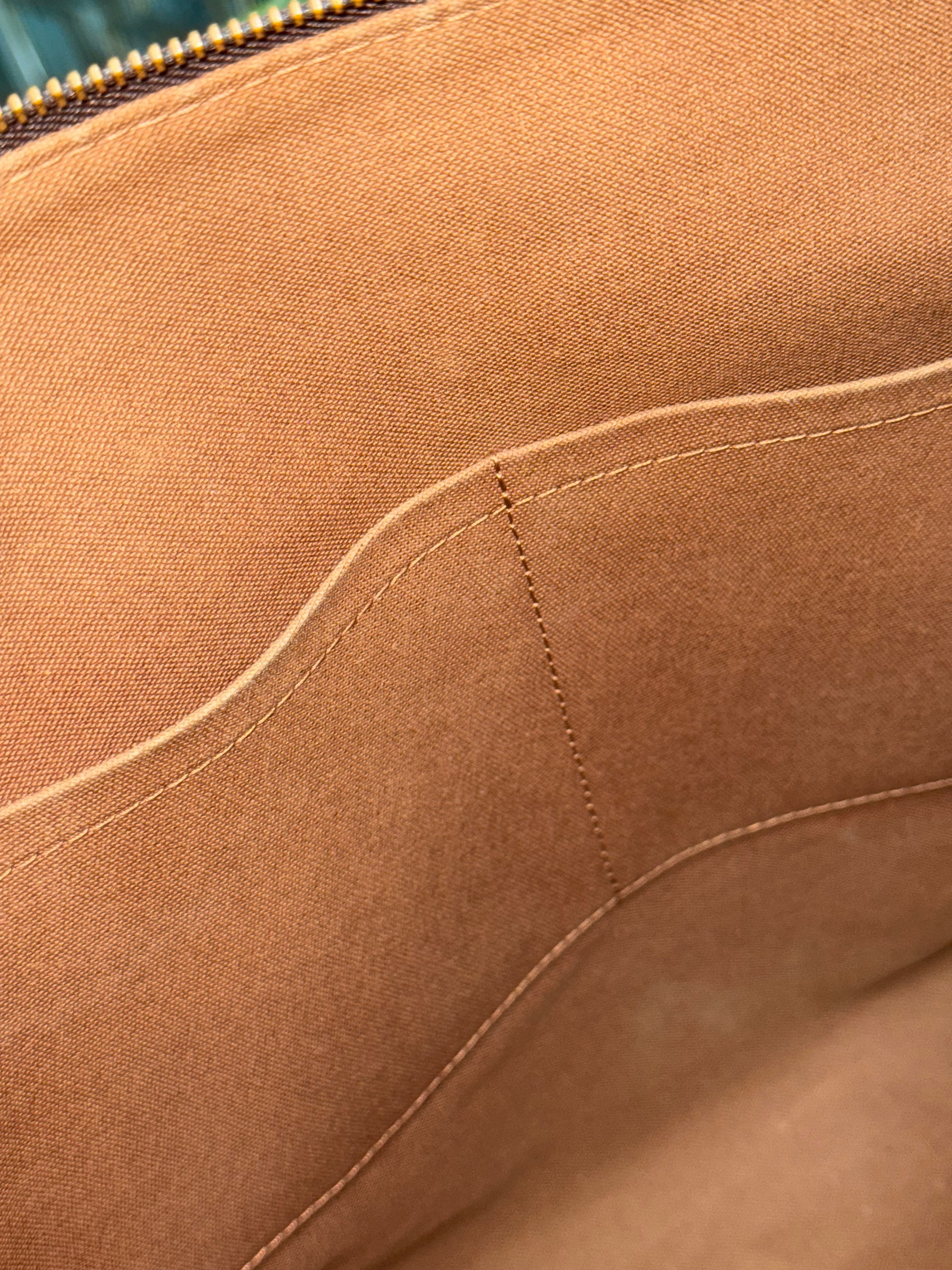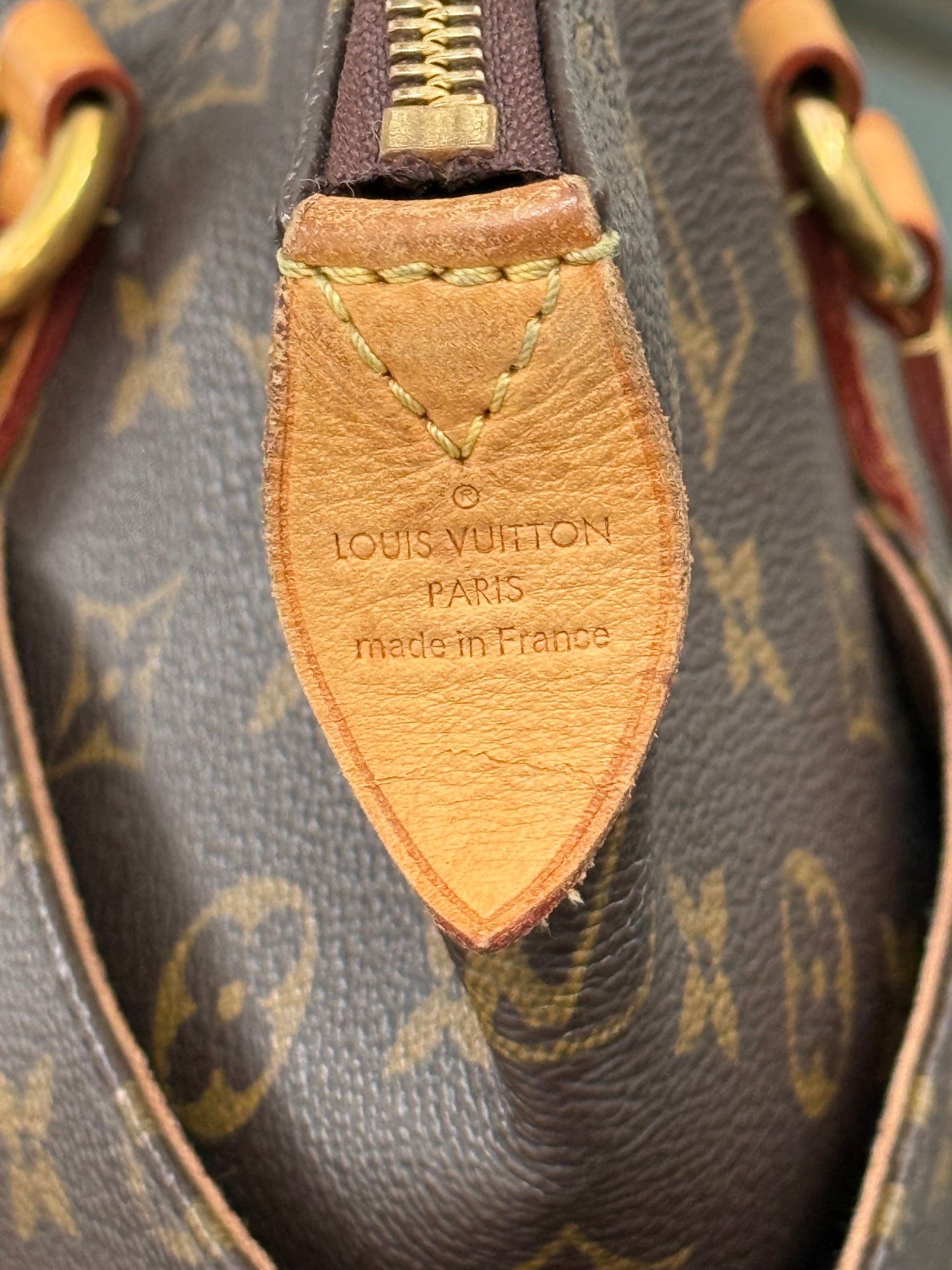 Leather: All tabs intact, no exposed piping. In nice patina and handle shows watermarks. Bottom piping is darkened. Overall it’s in great solid condition .