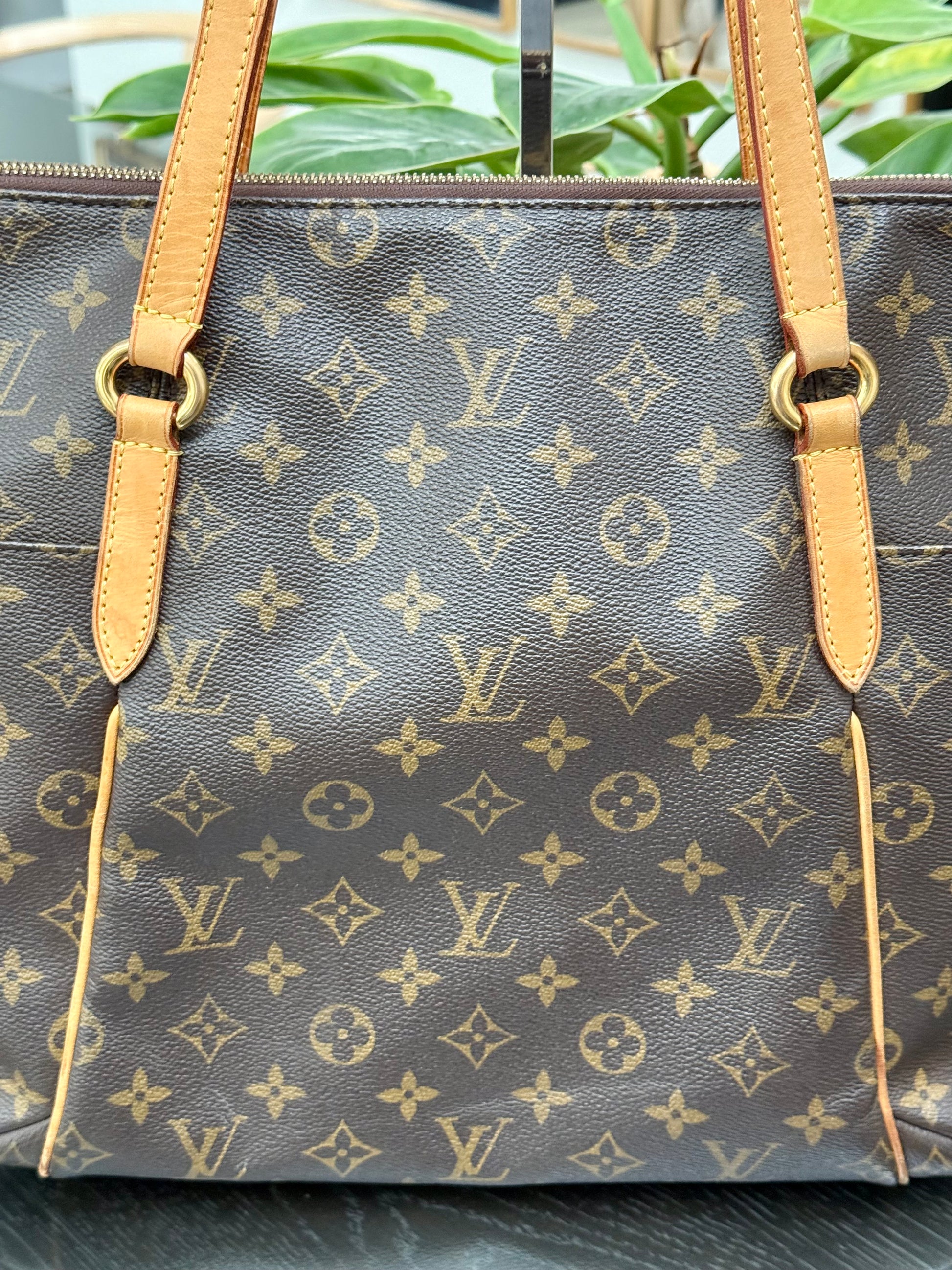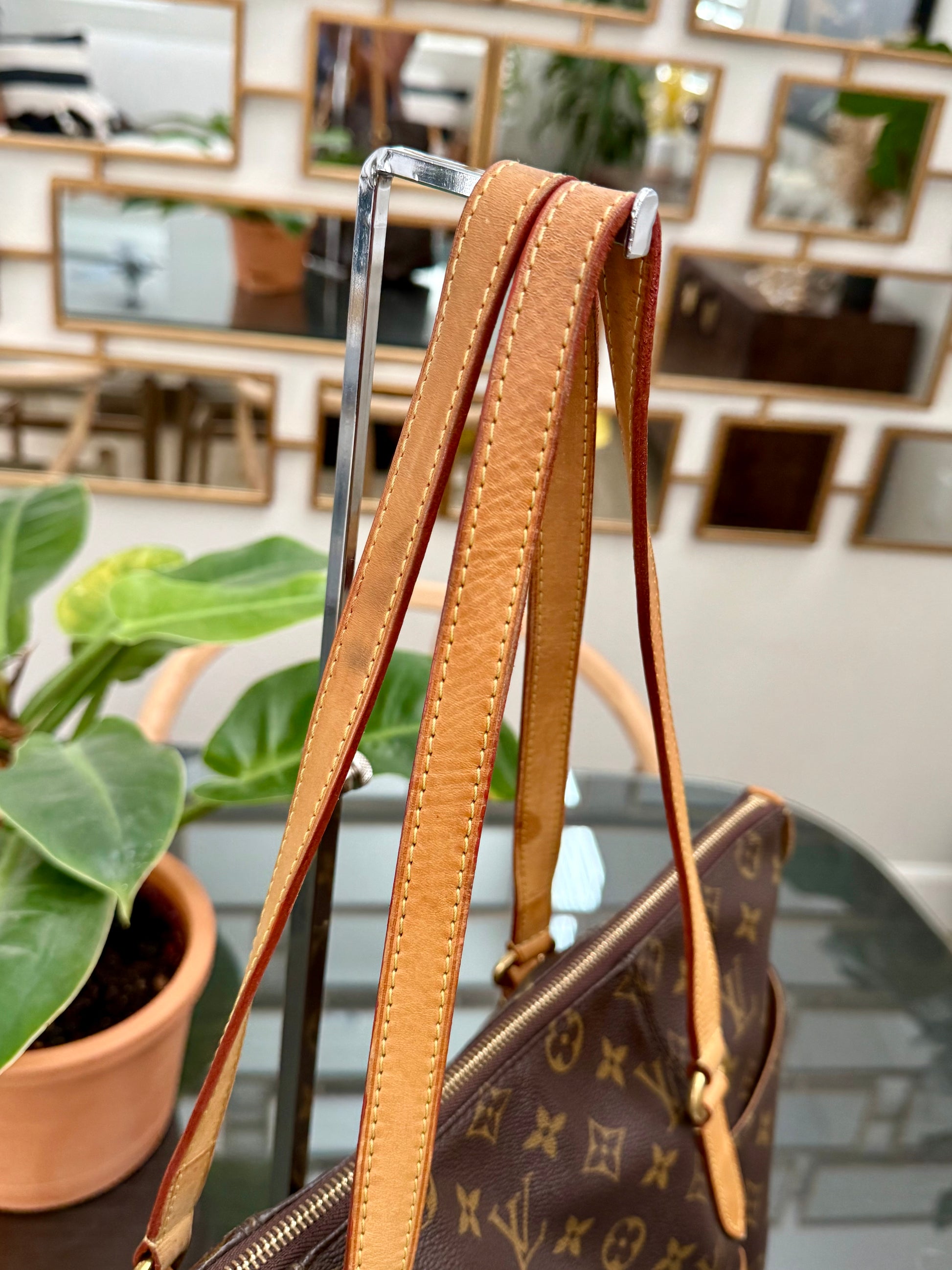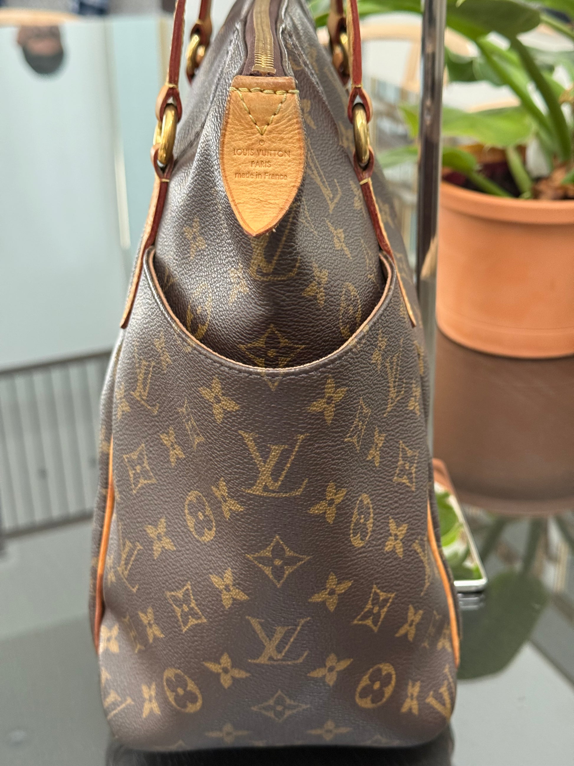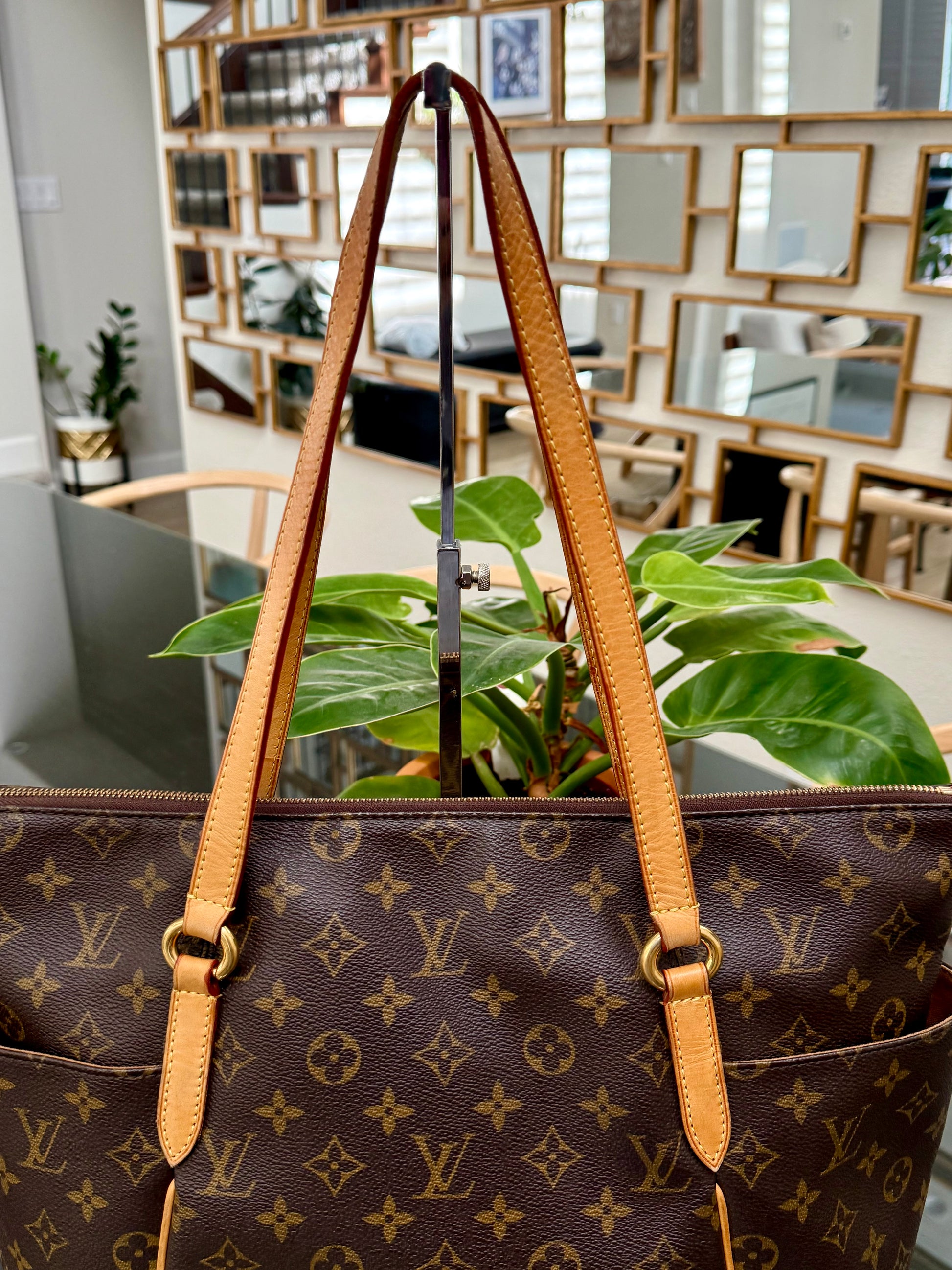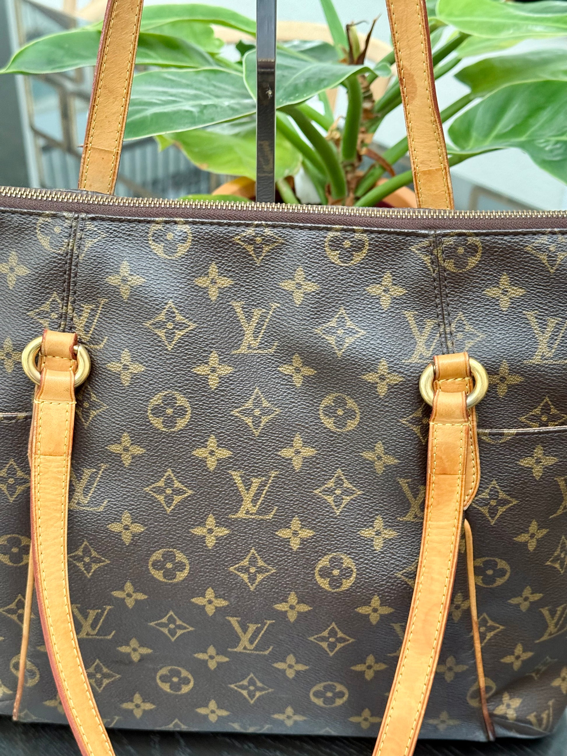 Leather: All tabs intact, no exposed piping. In nice patina and handle shows watermarks. Bottom piping is darkened. Overall it’s in great solid condition .