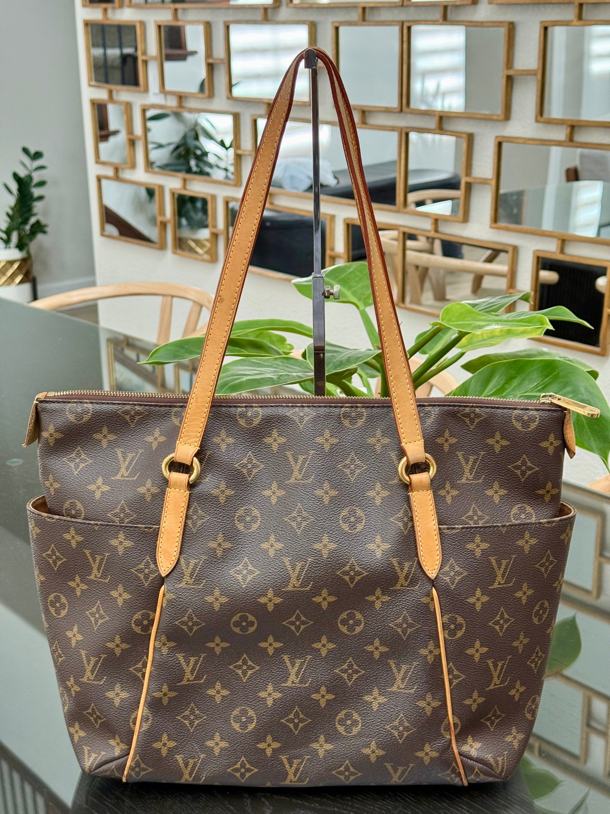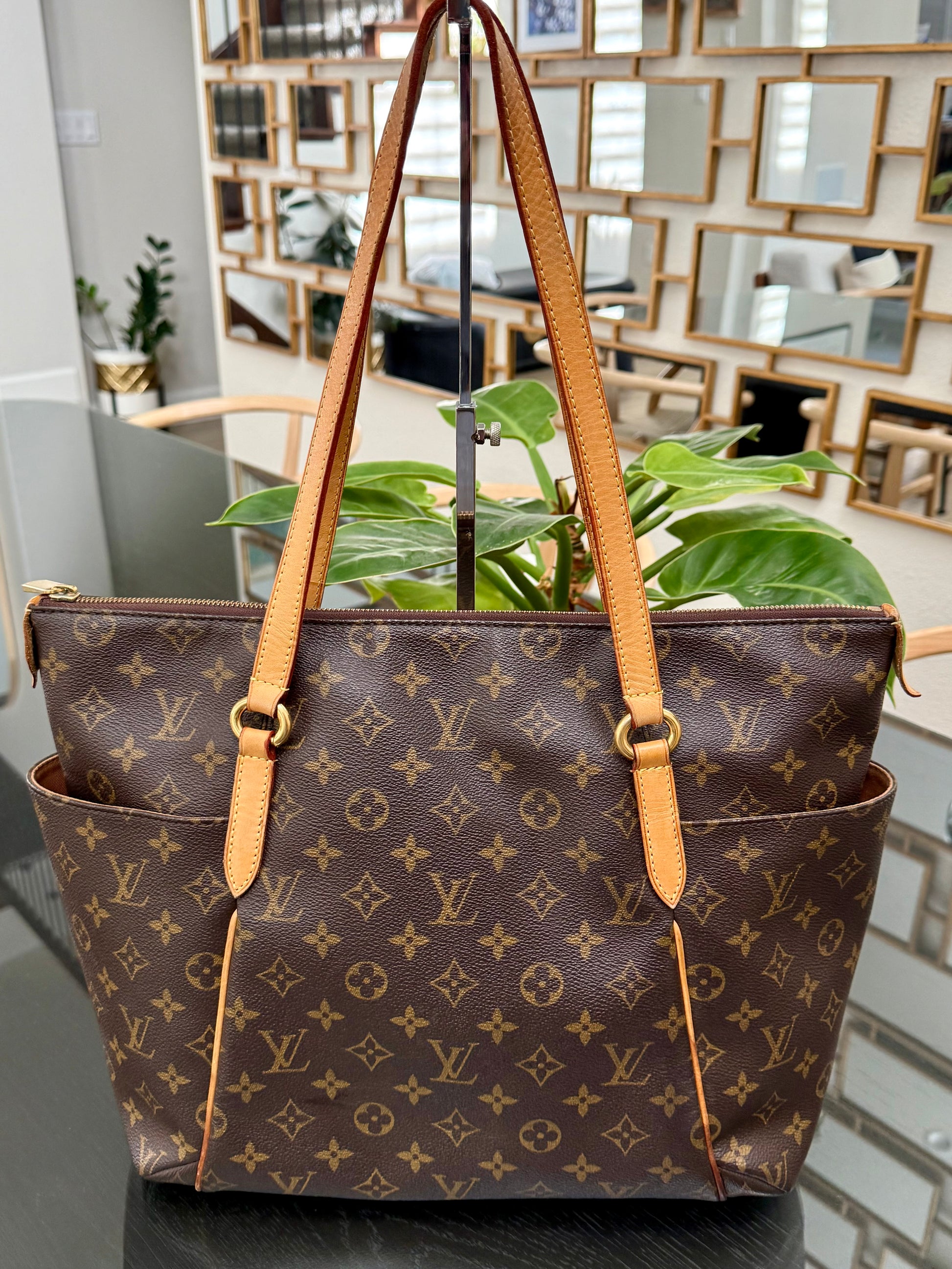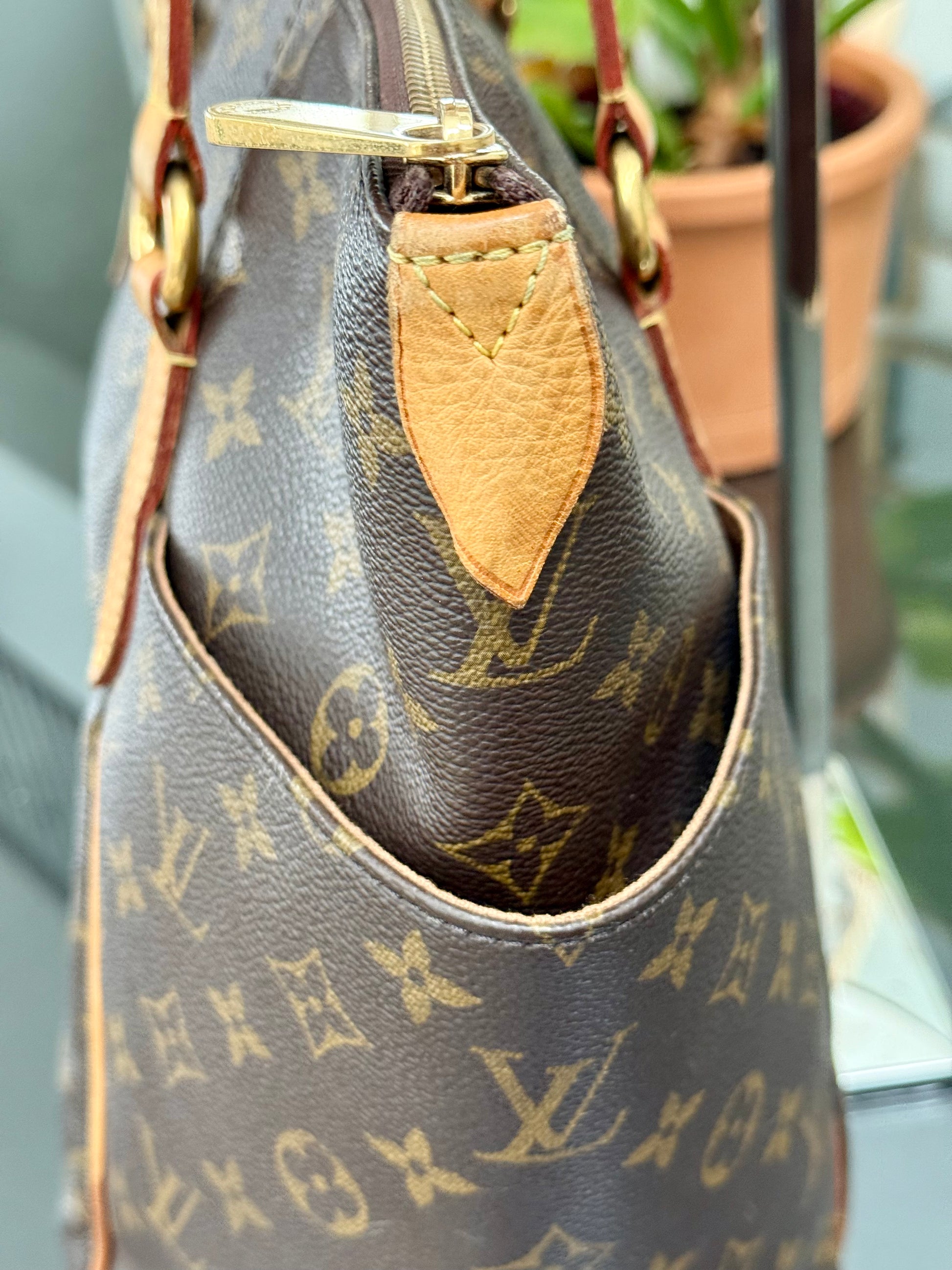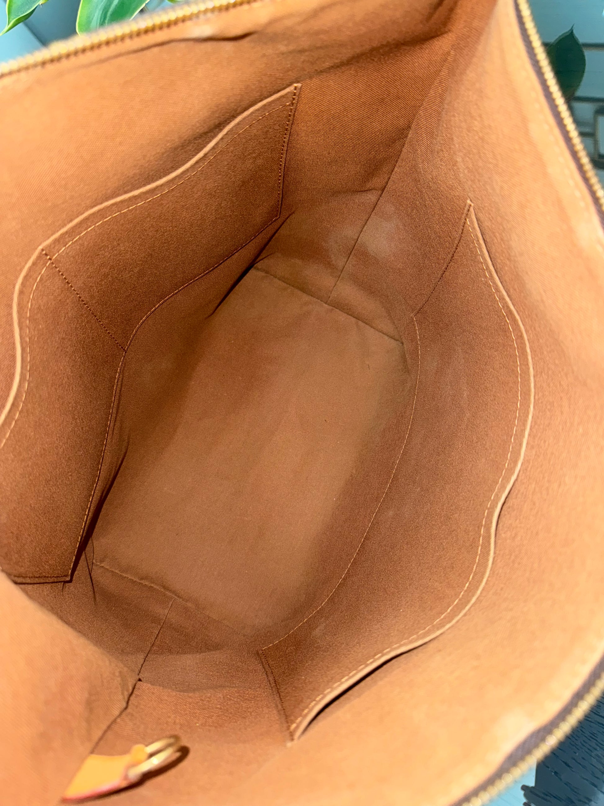 Leather: All tabs intact, no exposed piping. In nice patina and handle shows watermarks. Bottom piping is darkened. Overall it’s in great solid condition .