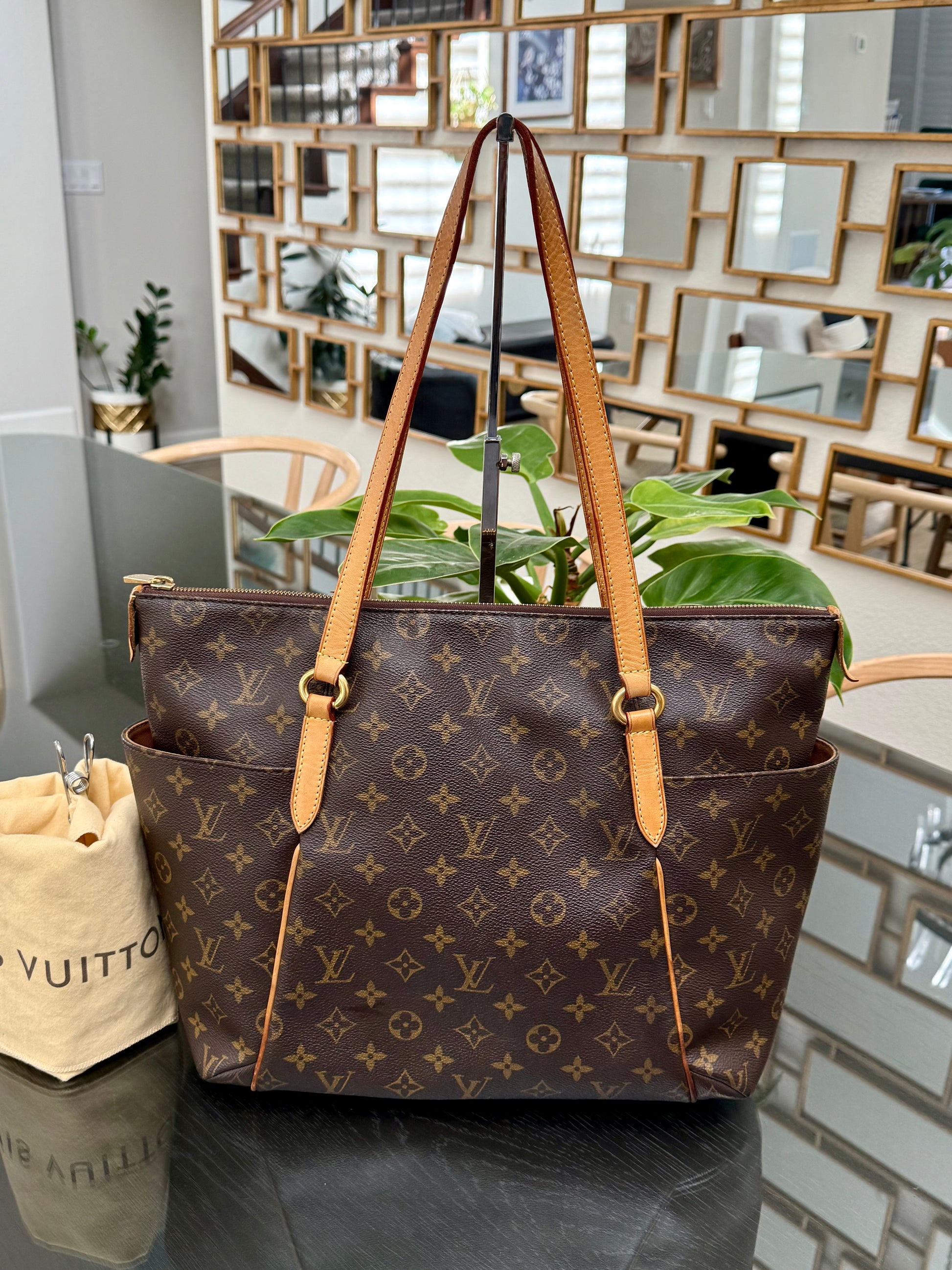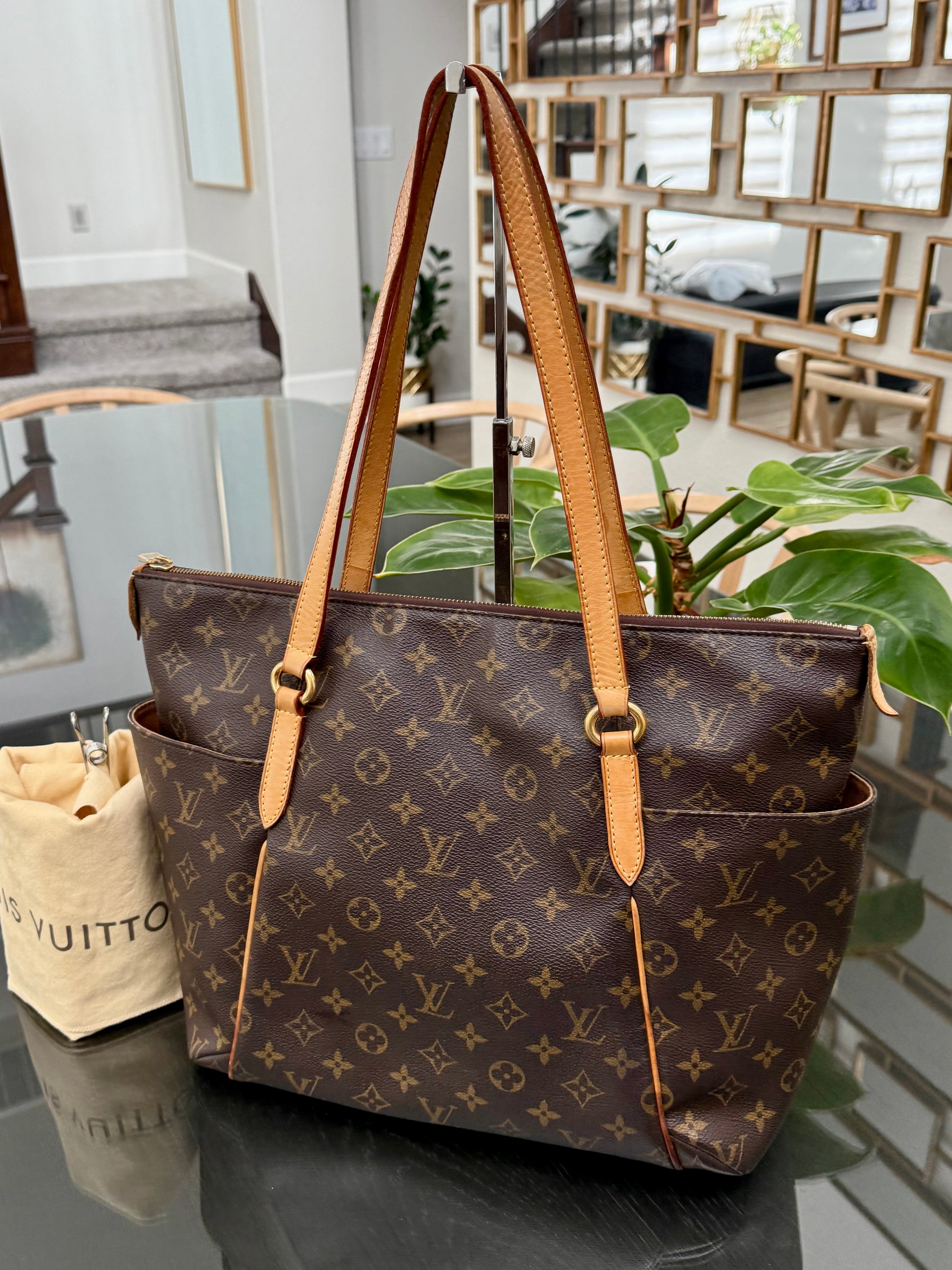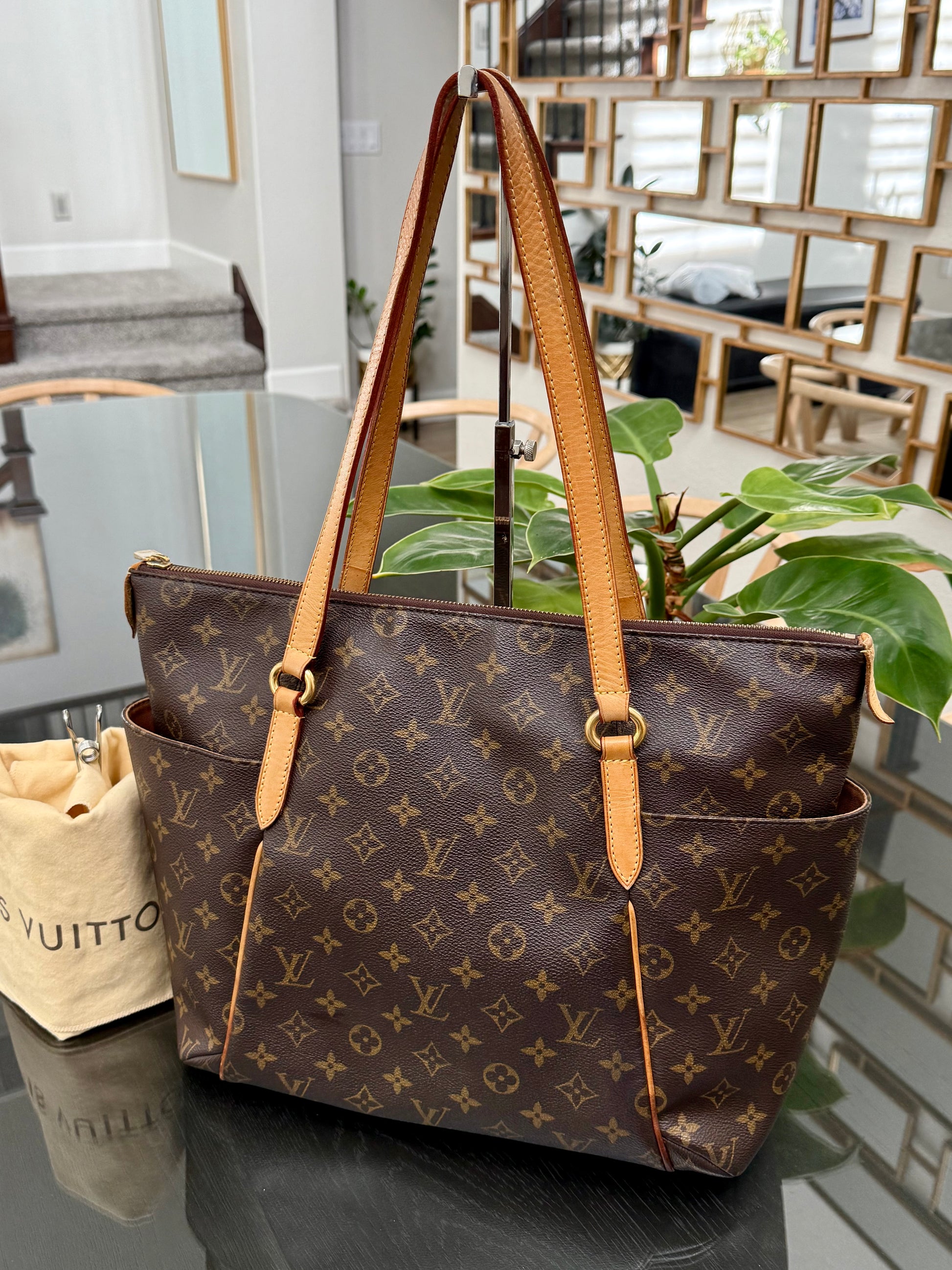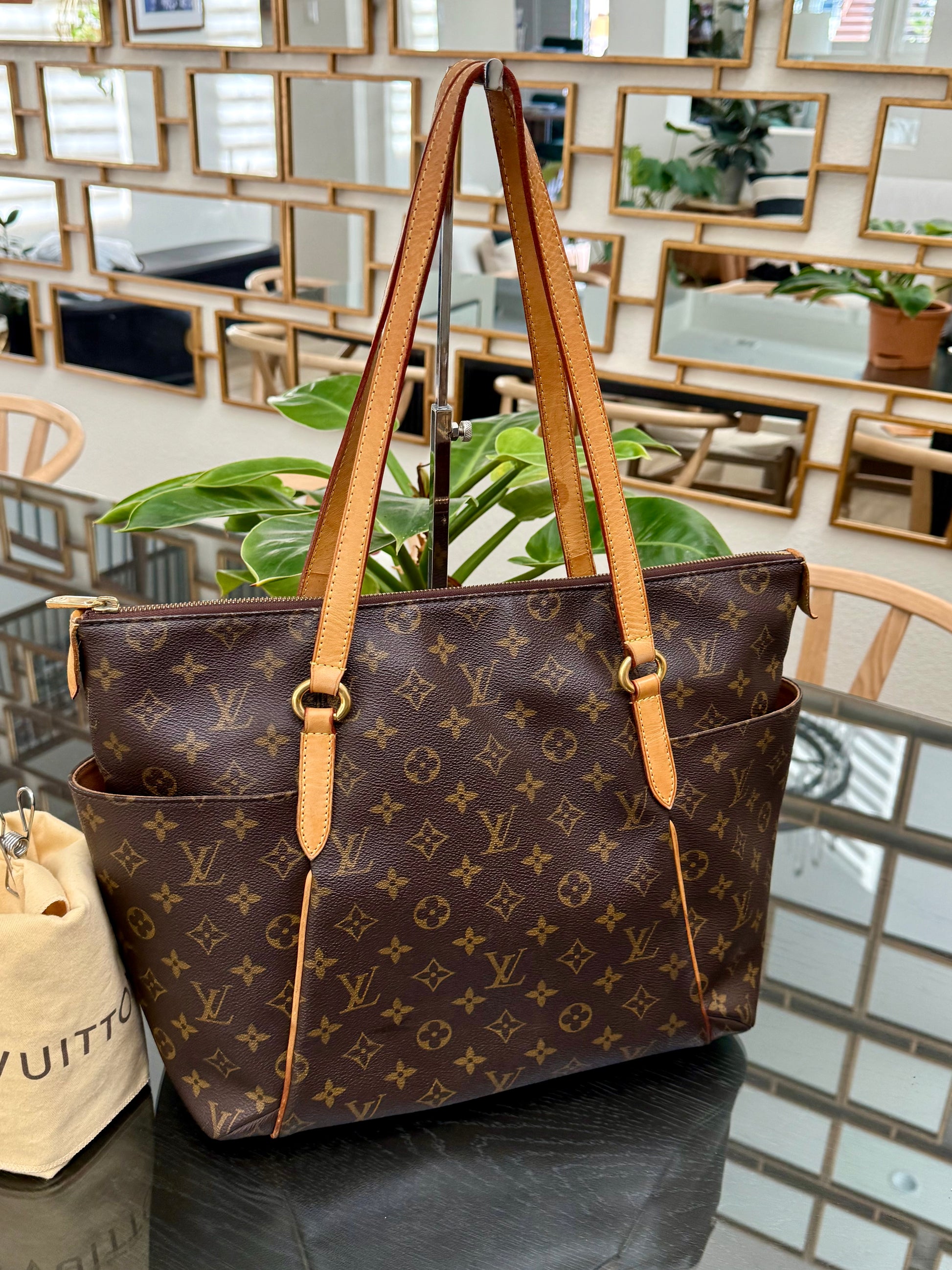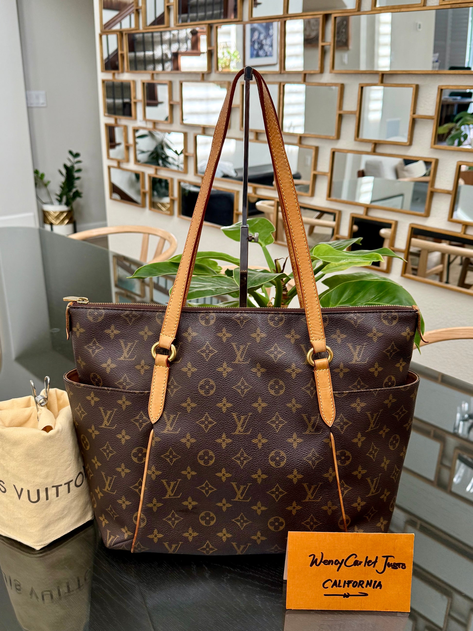 Leather: All tabs intact, no exposed piping. In nice patina and handle shows watermarks. Bottom piping is darkened. Overall it’s in great solid condition .